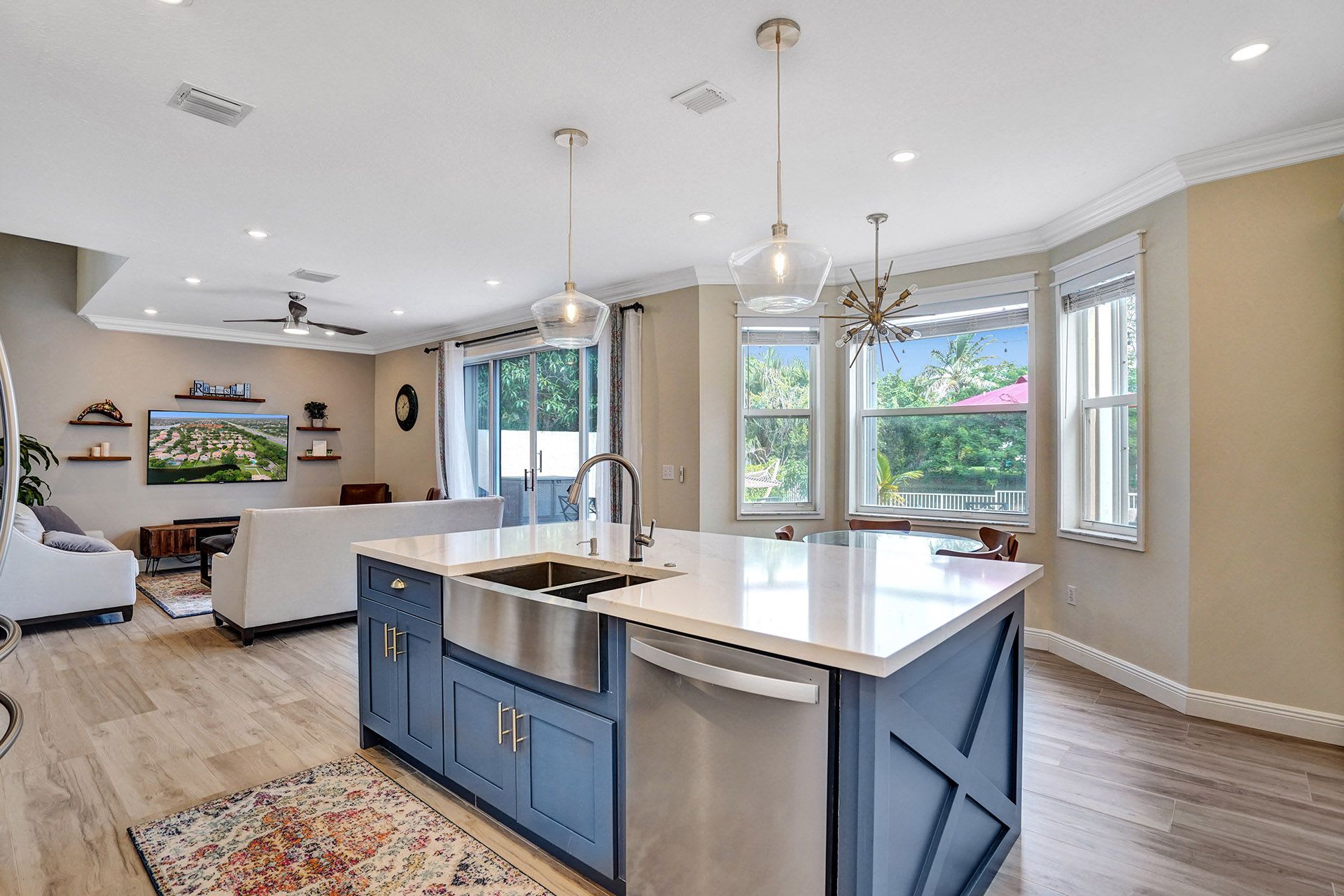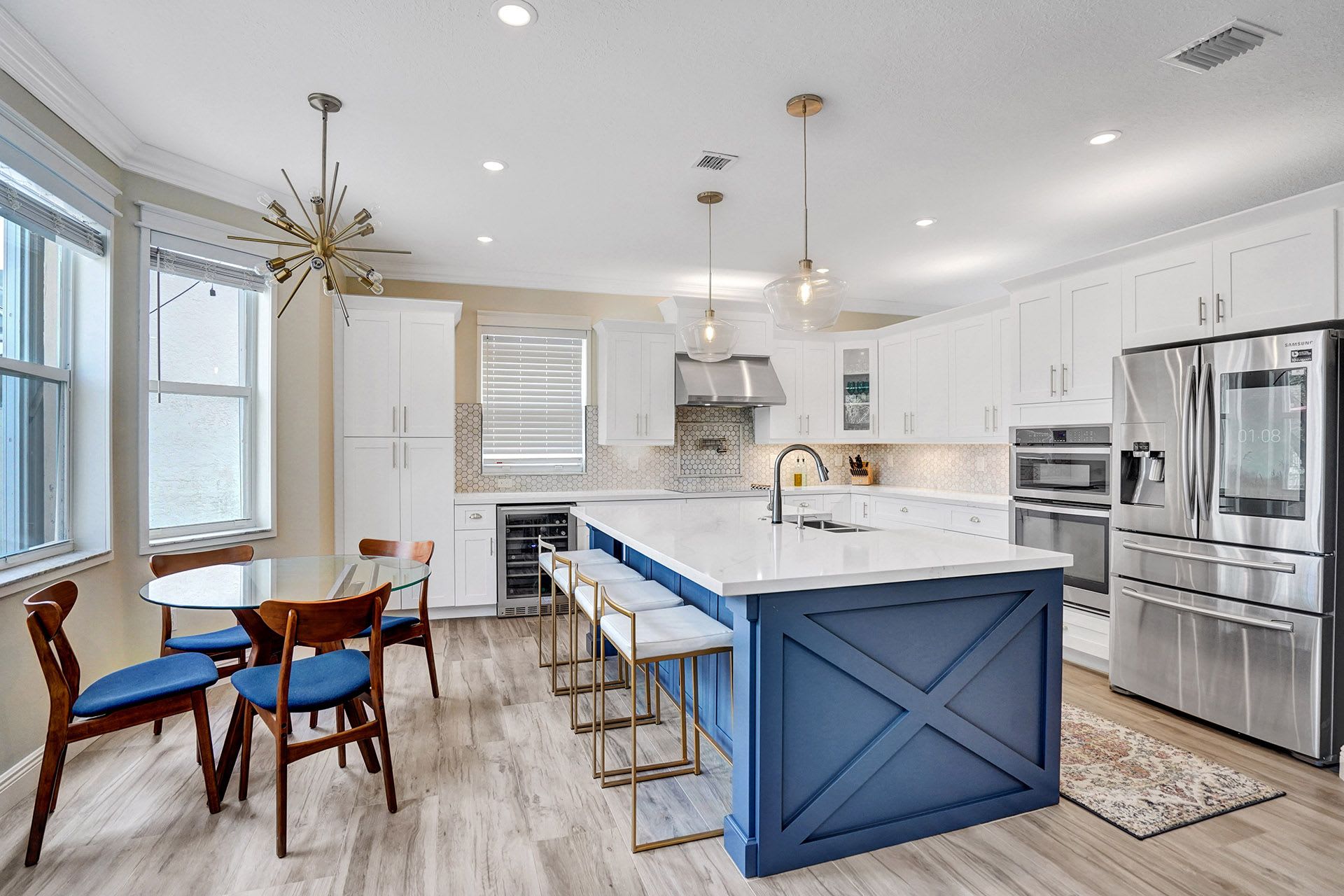 - Custom-built chefs kitchen featuring a huge center island with farm sink, quartz countertops, custom cabinets, stainless steel appliance, and smart refrigerator.
