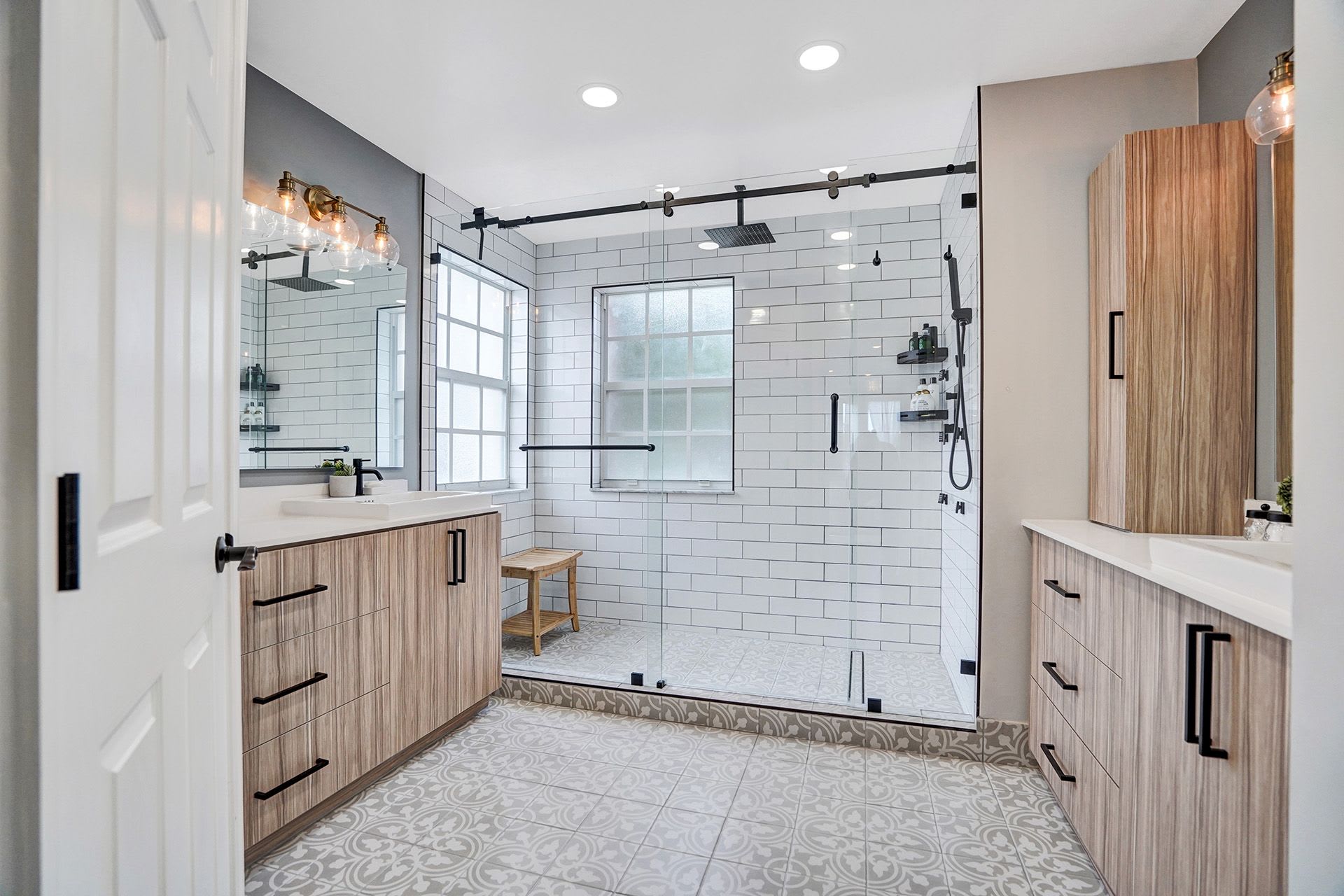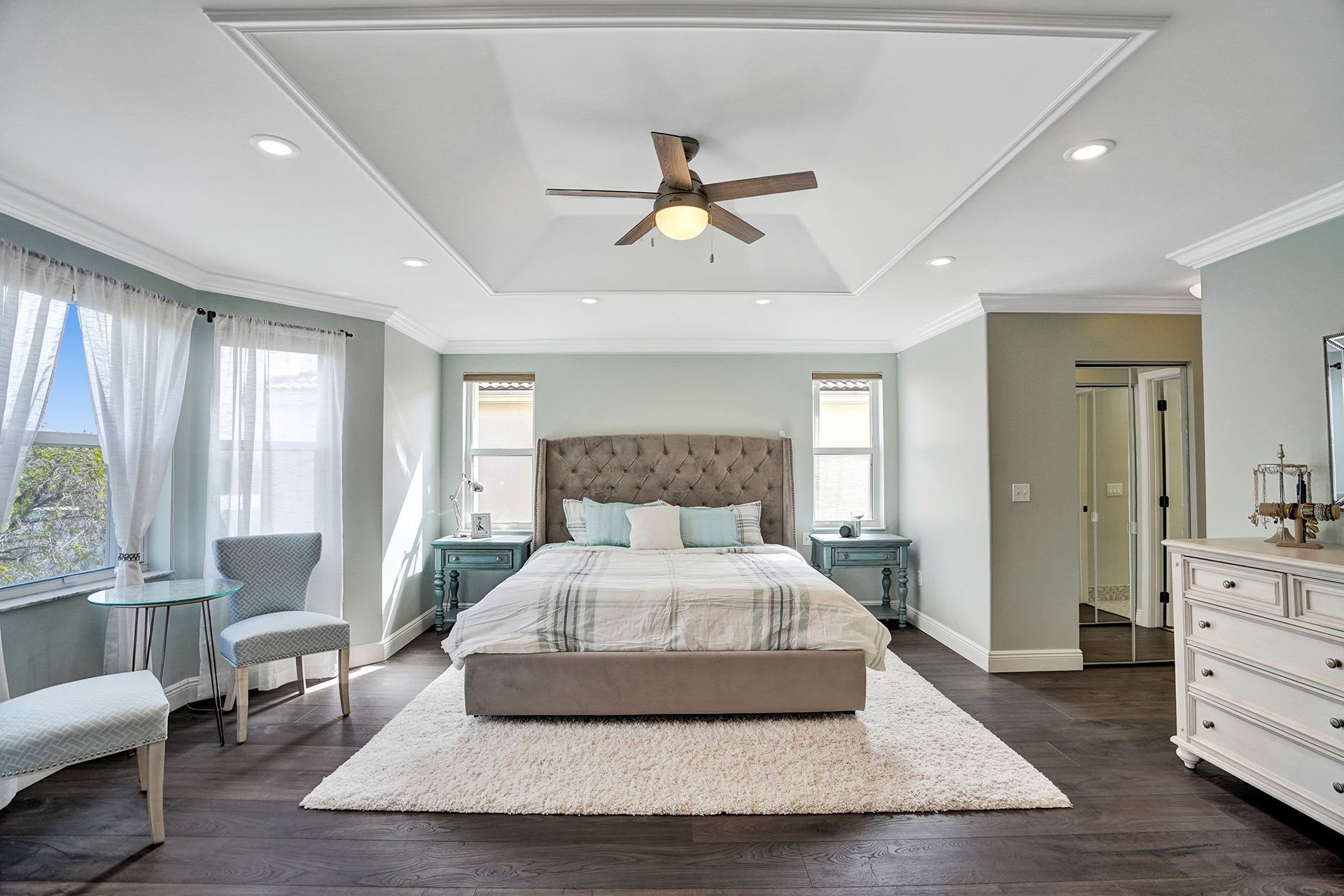 - Master bedroom w/ French door entry, custom bathroom w/ barn door, 2 walk-in closets, and a sitting area or office.